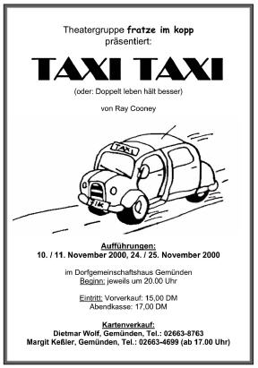 Autor Cooney bringt seine Figuren aus ihrem bescheidenen Alltag in die aberwitzigsten Situationen. Eine unvorhergesehene Winzigkeit läuft schief und schon stehen seine Helden im größten Dilemma ihres Lebens. Um sich zu retten, erfinden sie haarsträubende Erklärungen für absurde Vorfälle. TAXI TAXI, auch unter dem Titel Doppelt leben hält besser, wurde 1999 in der Komödie am Kurfürstendamm in Berlin und auf vielen anderen Bühnen Deutschlands gespielt.