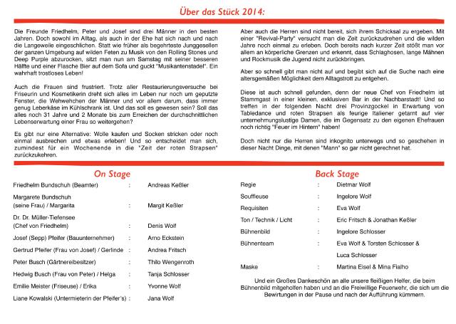 Auch die Frauen sind frustriert. Trotz aller Restaurierungsversuche bei Friseurin und Kosmetikerin dreht sich alles im Leben nur noch um geputzte Fenster, die Wehwehchen der Männer und vor allem darum, dass immer genug Leberkäse im Kühlschrank ist. Und das soll es gewesen sein? Soll das alles noch 31 Jahre und 2 Monate bis zum Erreichen der durchschnittlichen Lebenserwartung einer Frau so weitergehen? Es gibt nur eine Alternative: Wolle kaufen und Socken stricken oder noch einmal ausbrechen und etwas erleben! Und so entscheidet man sich, zumindest für ein Wochenende in die "Zeit der roten Strapsen" zurückzukehren.