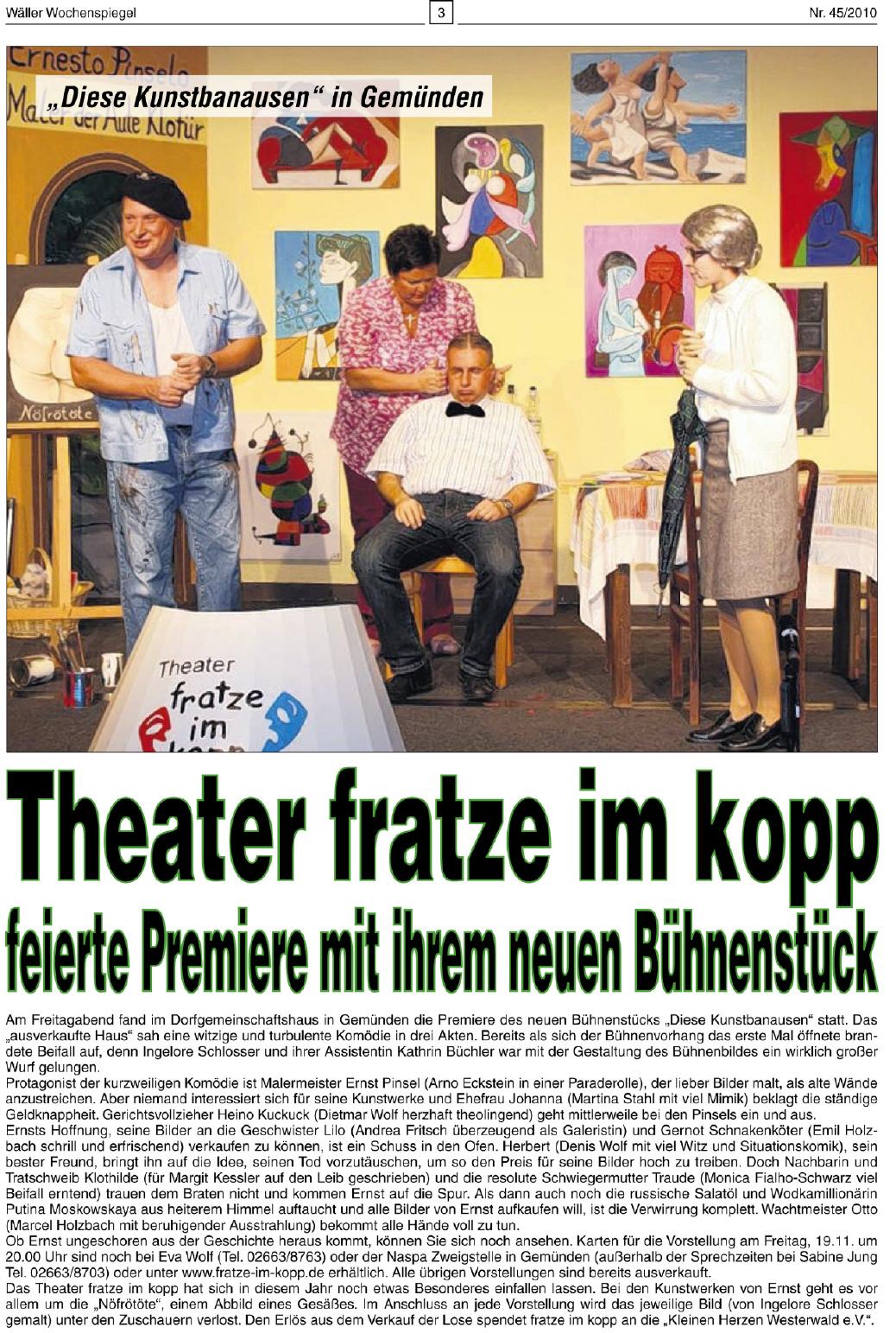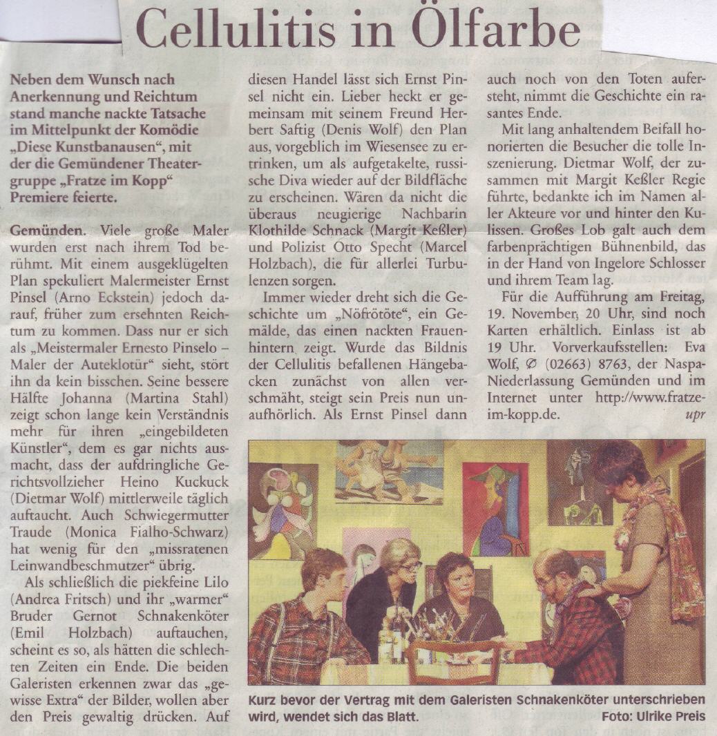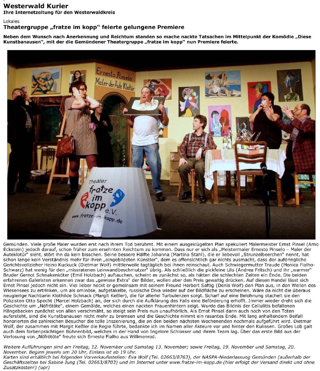 Sie sind hier: Startseite » Retrospektive » Presse 2010 Diese Kunstbanausen Westerwald Kurier Westerwälder Zeitung Nassauische Neue Presse Wäller-Wochenspiegel Lokalanzeiger 2009 Je oller desto toller 2011 Heribert Der Klosterfraunarzissengeist