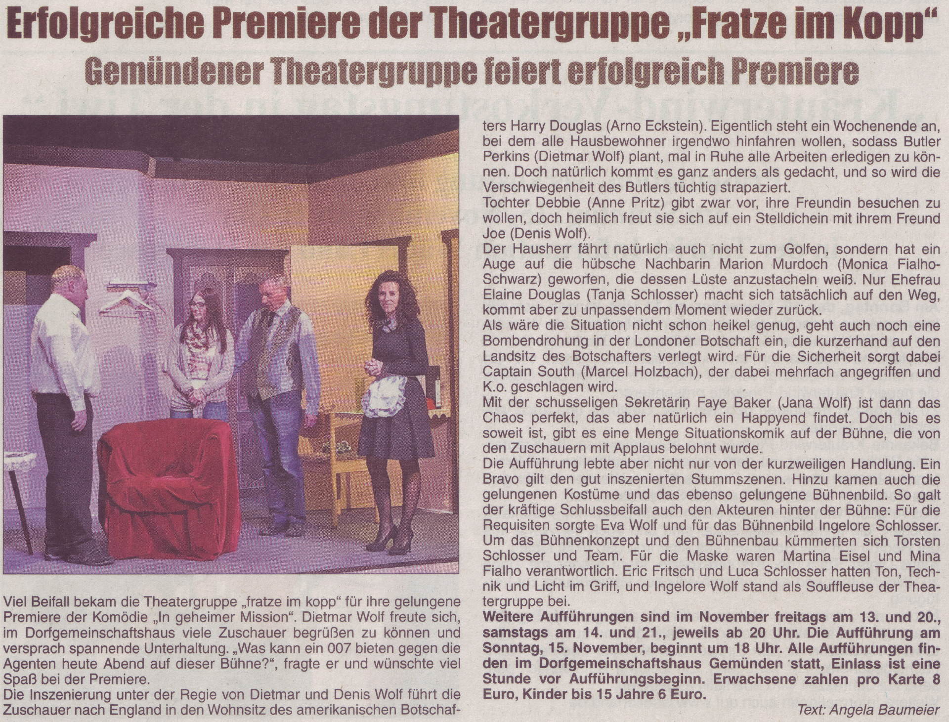 Sie sind hier: Startseite » Retrospektive » Presse 2015 In Geheimer Mission Westerwälder Zeitung - Oktober 2015 Westerwälder Zeitung - 09.11.2015 "Mimen erfolgreich In geheimer Mission unterwegs - Beifall Akteure von fratze im kopp feierten eine gelungene Premiere Wäller Wochenspiegel - 11.11.2015 2014 Leberkäs' und rote Strapse 2017 Hotel im Angebot
